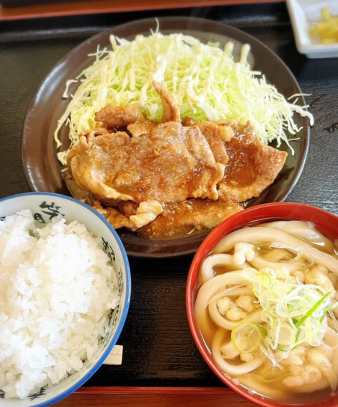 ニンニクたっぷりの甘辛豚焼肉にご飯、そしてミニうどんが付くボリューム満点の定食は、地元民に長く愛されています。