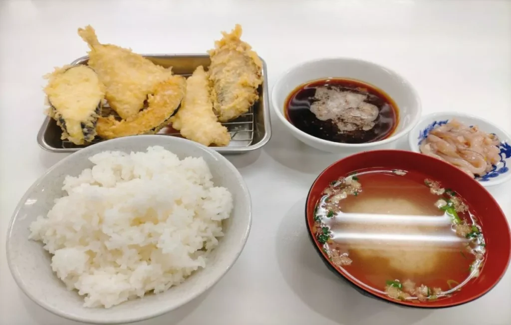 天ぷらはきす・白身・青魚(さば)・いか・野菜3品(野菜は固定でカボチャ・ナス・ピーマン)の合計で約7品前後が、