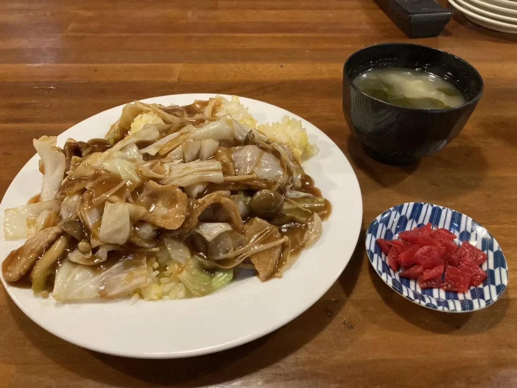 その上に、めんつゆをベースにしたあっさり醤油味の肉野菜あんかけがたっぷりと乗せられているのが特徴です。