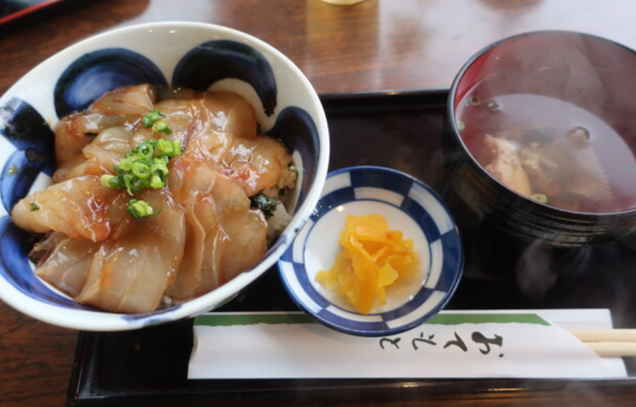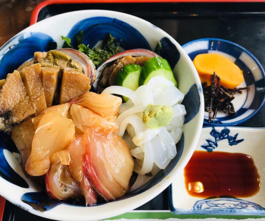 べっこう漬けの白身魚(カンパチなど)に加え、トコブシ(アワビの仲間)やイカそうめん、島のりなどが豪華にのった海鮮丼になります。