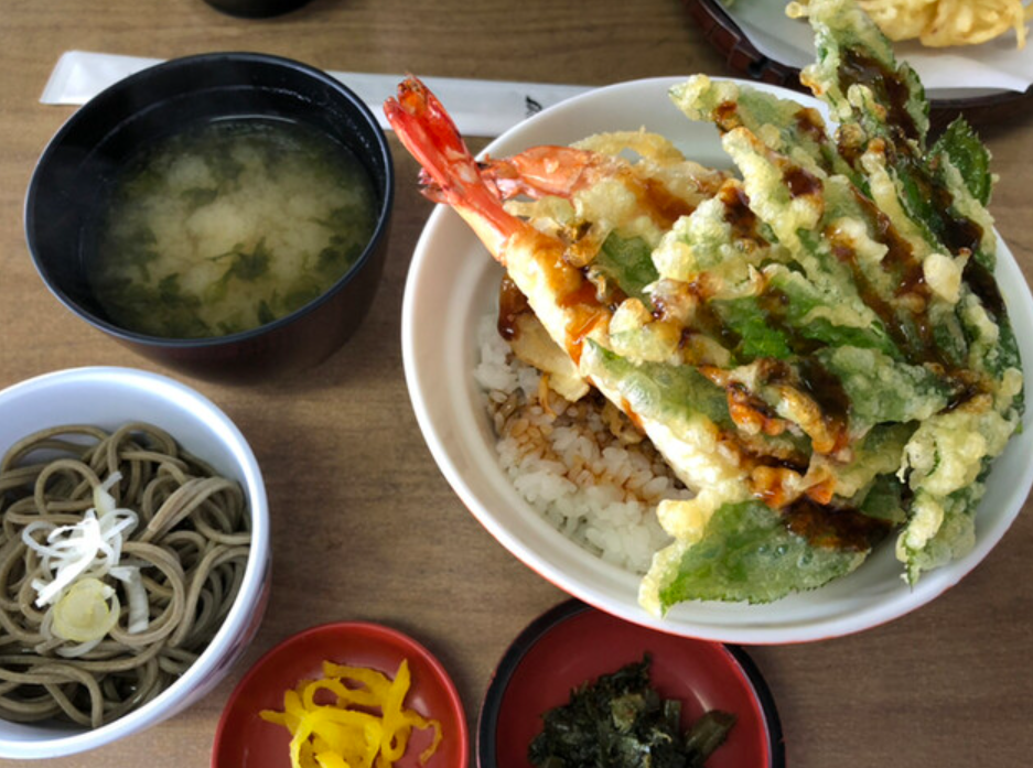 大島特産の明日葉天ぷらが大きくて存在感があり、海老より目立つ盛り付けで、島らしさ満載。