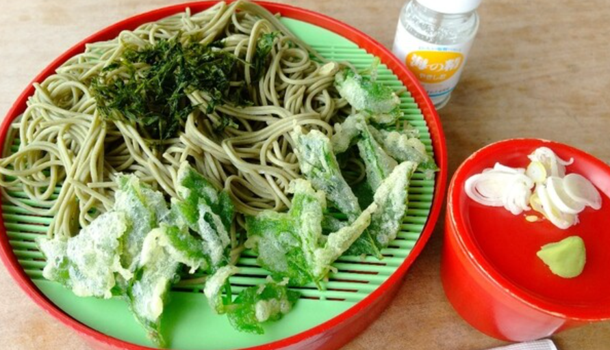麺は明日葉(あしたば)を練り込んだ緑色のそばになっており、神田やぶのクロレラそばより深緑で、明日葉の風味がほんのり香ります。