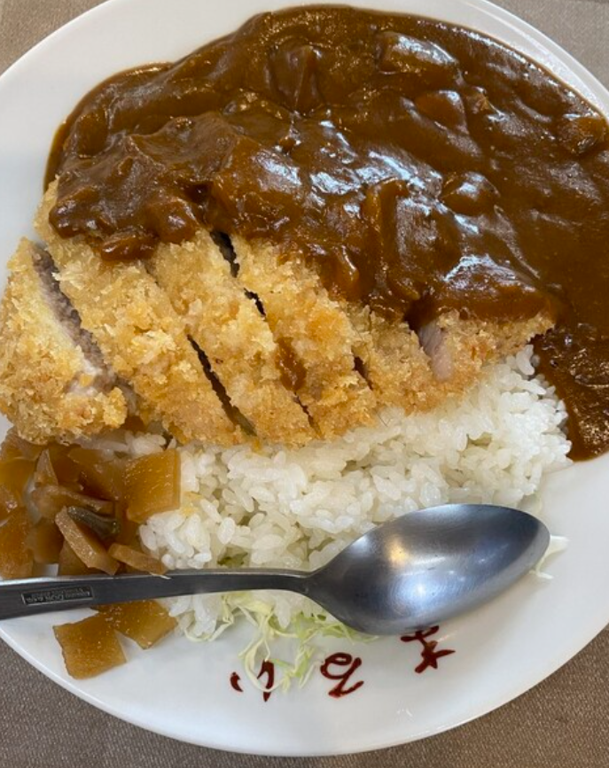 まるい食堂のカツカレーは店のデカ盛りスタイルを代表する人気メニューの一つで、厚切りリブロースのカツを豪快にのせたガッツリ系カレーです。