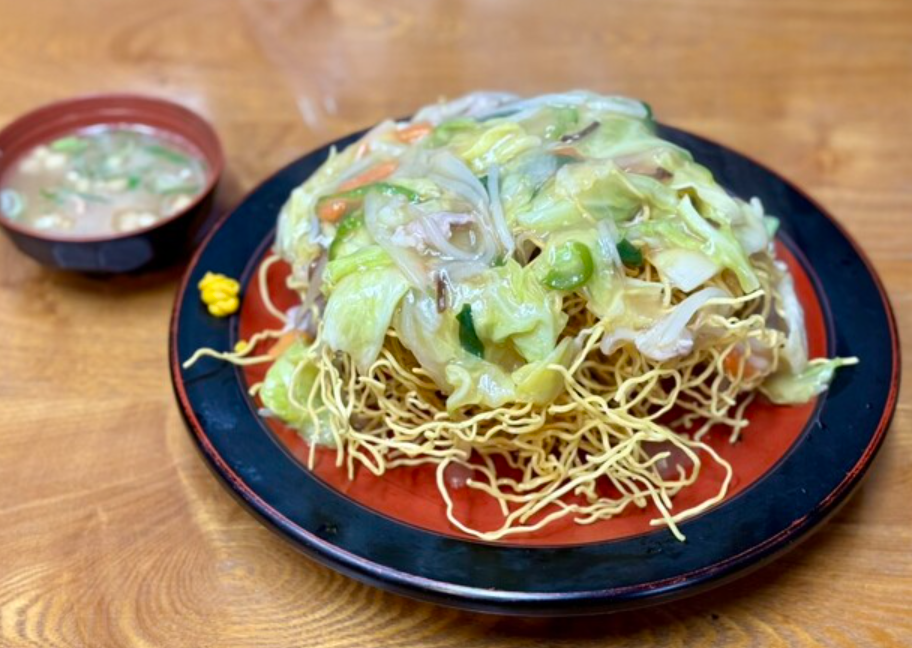 パリパリの揚げ麺に具だくさんの熱々あんかけがたっぷりかかったインパクト大の一品。