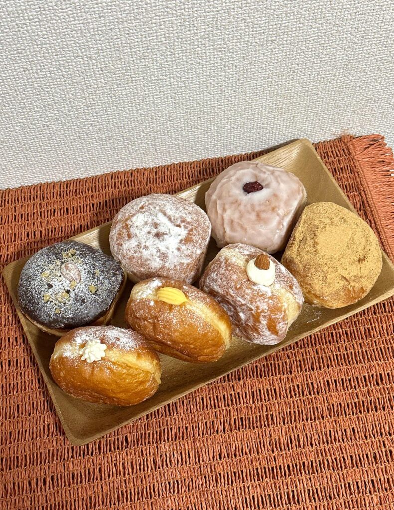 宇土店ではレギュラーメニュー約10種類に加え、宇土店限定アーモンドミルクが加わり、合計で11種類程度のドーナツが並びます。