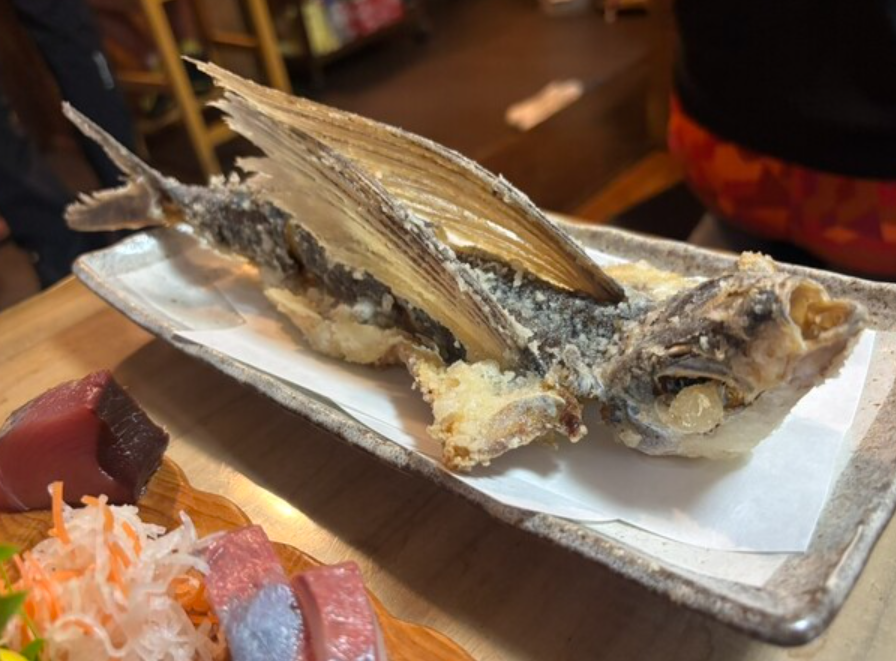 トビウオを丸ごと姿のまま揚げた一品で、羽やヒレが広がったまま登場し、迫力満点です。